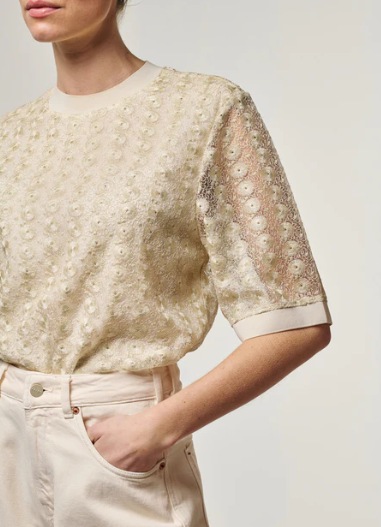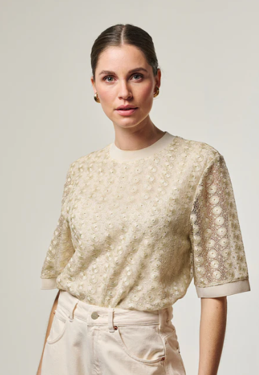 De Julice top is een vrouwelijke top met een rustige uitstraling. De jacquardstof heeft een licht glanzend effect en een fijn patroon. De pasvorm is recht en comfortabel, met korte mouwen en een ronde hals. De boorden in een contrasterende kleur zorgen voor een nette afwerking. Een stijlvol item dat makkelijk te combineren is.