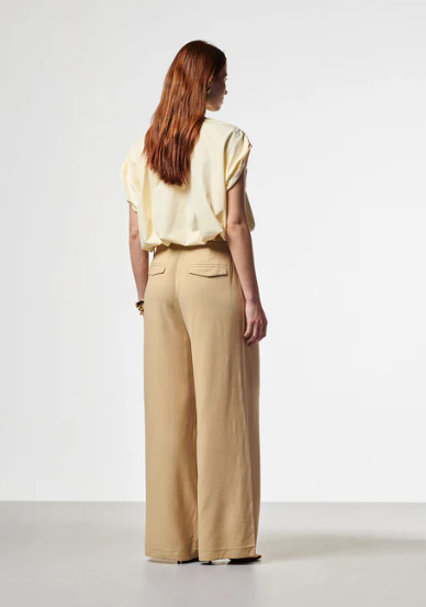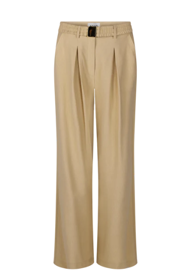 Deze broek heeft een elegante en luchtige uitstraling. Het model is hoog in de taille en valt los langs het been, wat zorgt voor een flatterend en comfortabel silhouet. De plooien aan de voorzijde geven extra verfijning, terwijl de elastische tailleband met gespdetail zorgt voor een moderne touch.