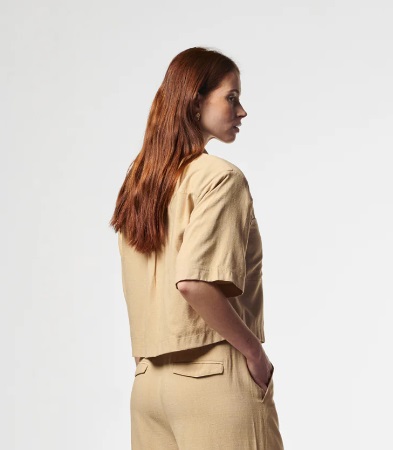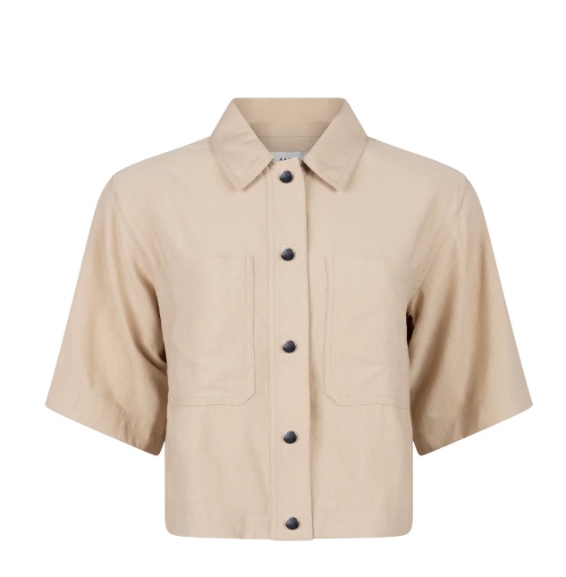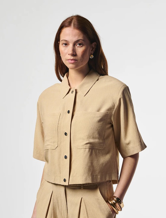 Deze blouse heeft een stoere en moderne uitstraling. Het korte model met kraag en knoopsluiting geeft een eigentijdse look, terwijl de borstzakken zorgen voor een subtiel utilitair detail. De rechte pasvorm maakt de blouse makkelijk te combineren.