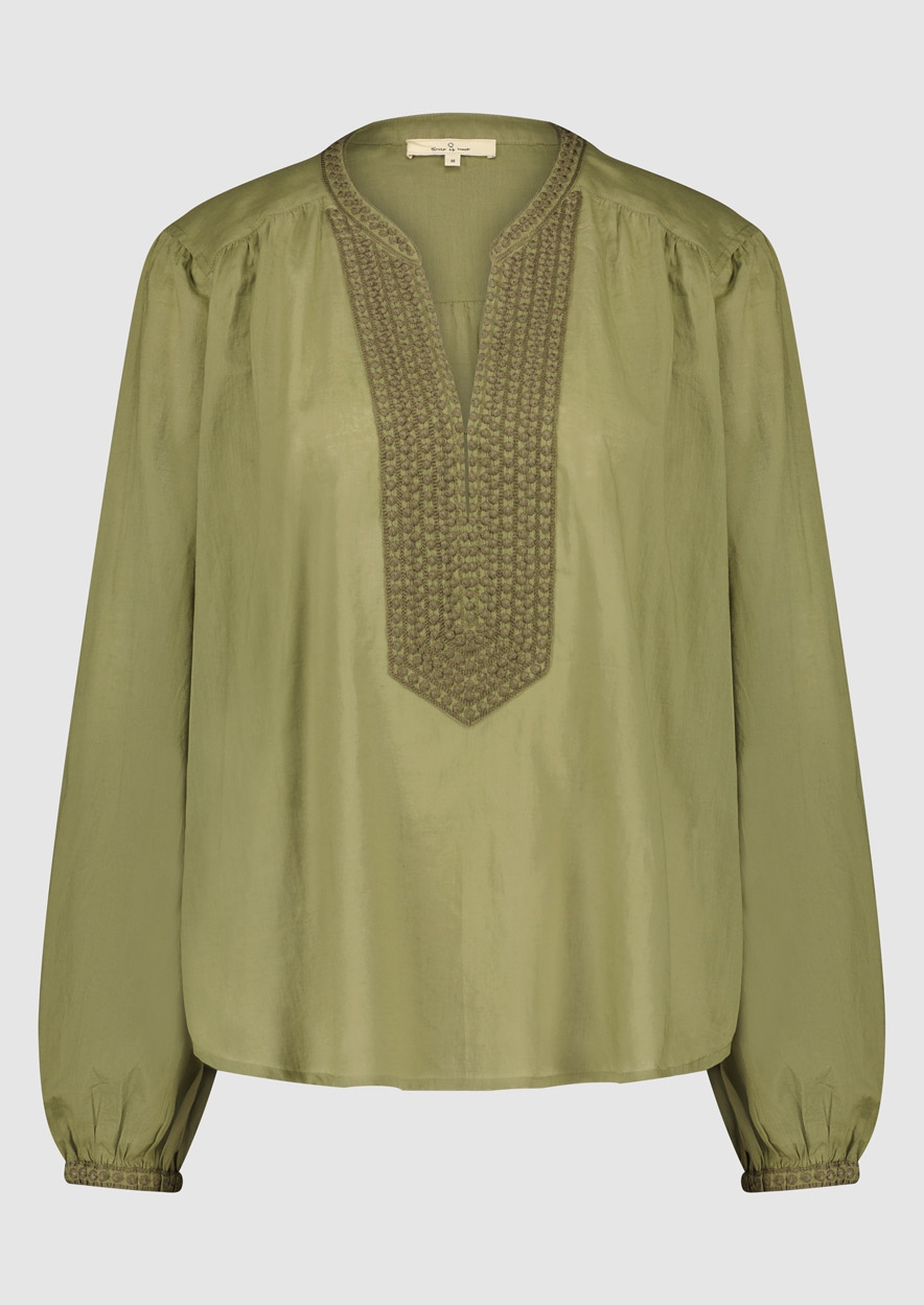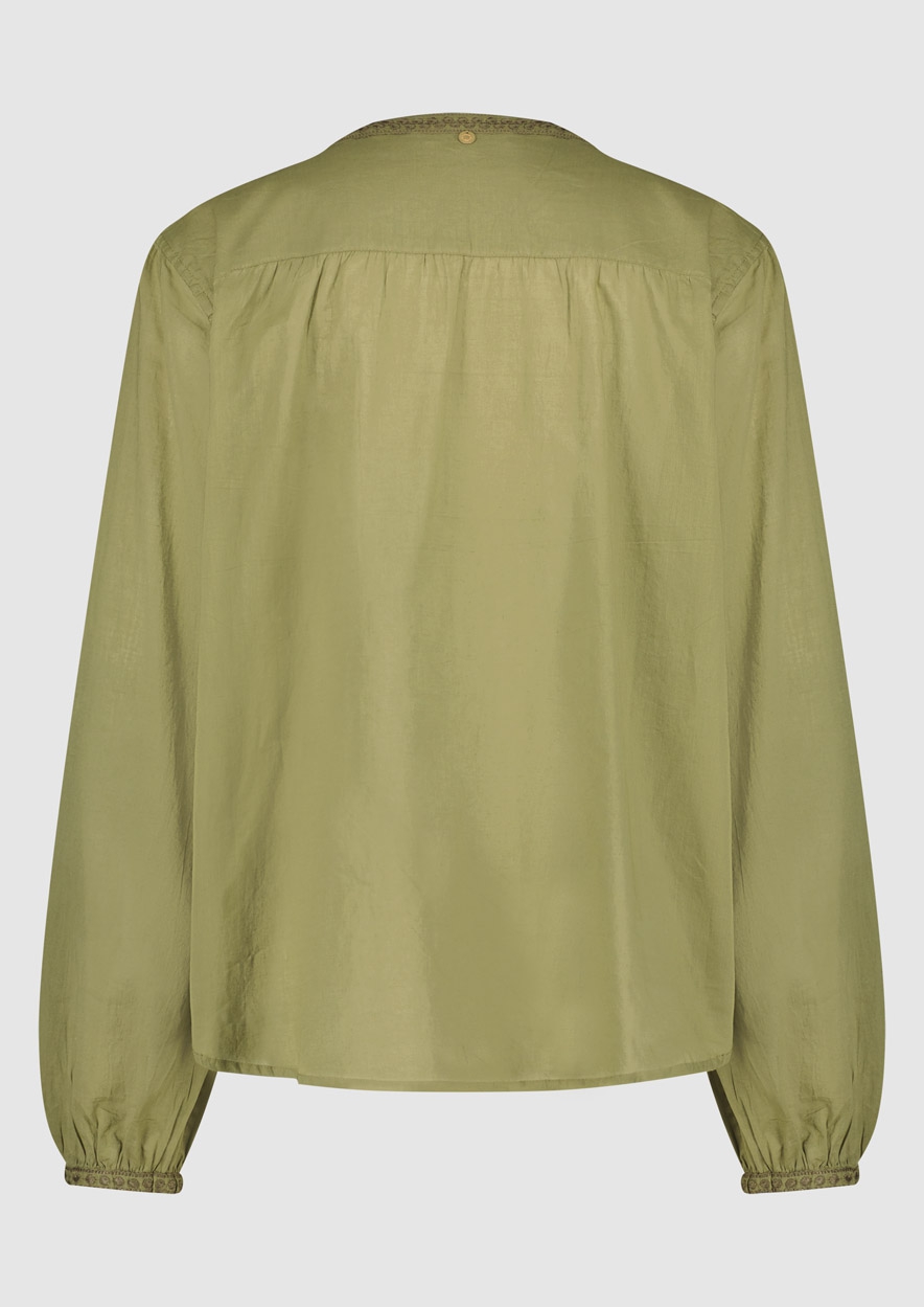 Soepelvallende dames blouse gemaakt van zacht katoen in een legergroene tint. De Donna blouse heeft diepe v-hals met een geborduurde halslijn.