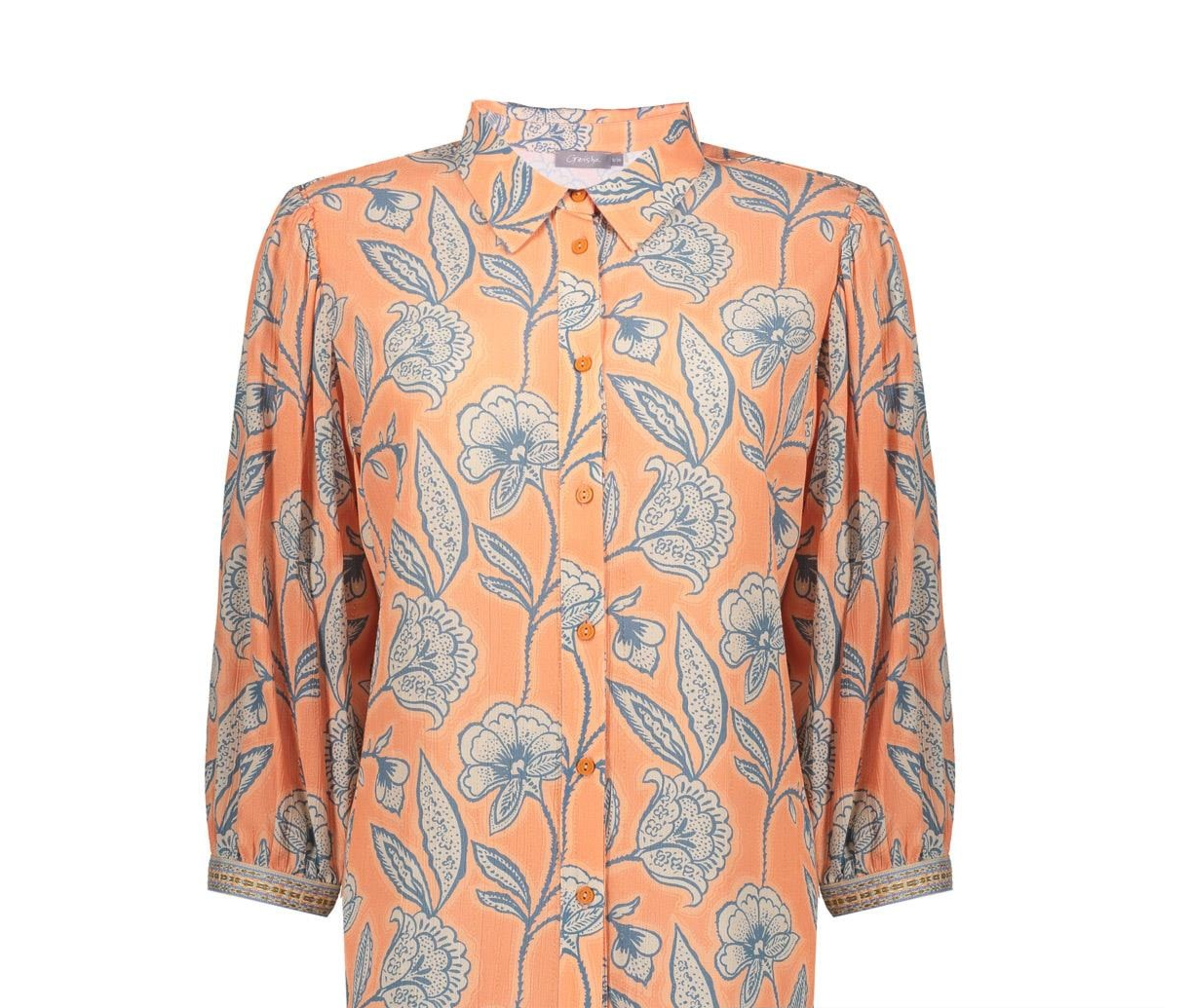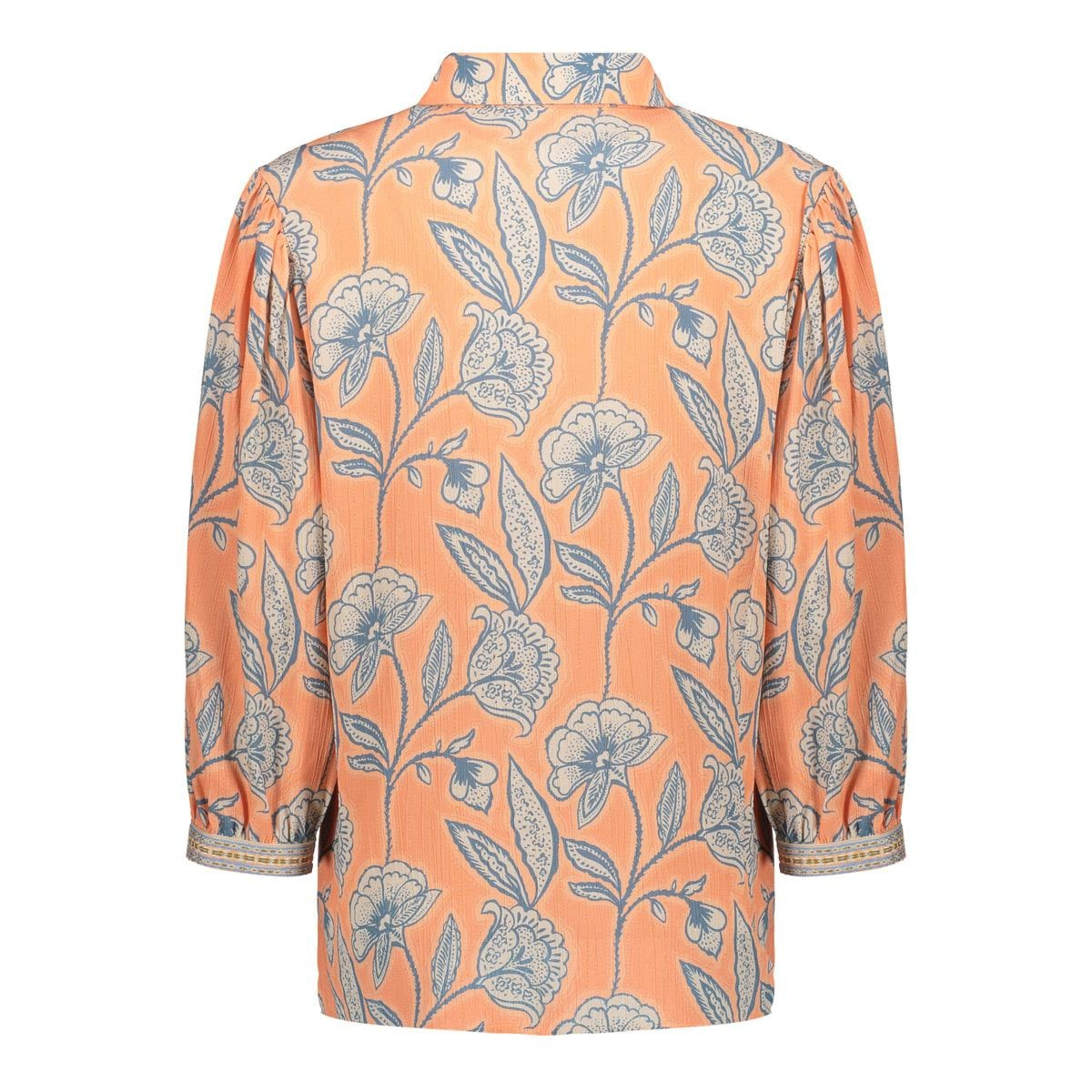 Deze blouse uit onze S26-1 collectie is uitgevoerd in een zachte peach tint met een verfijnd botanisch bloemendessin. De soepele kwaliteit draagt comfortabel en geeft een vrouwelijke uitstraling. De decoratieve manchetten en klassieke kraag zorgen voor een elegante finishing touch.
