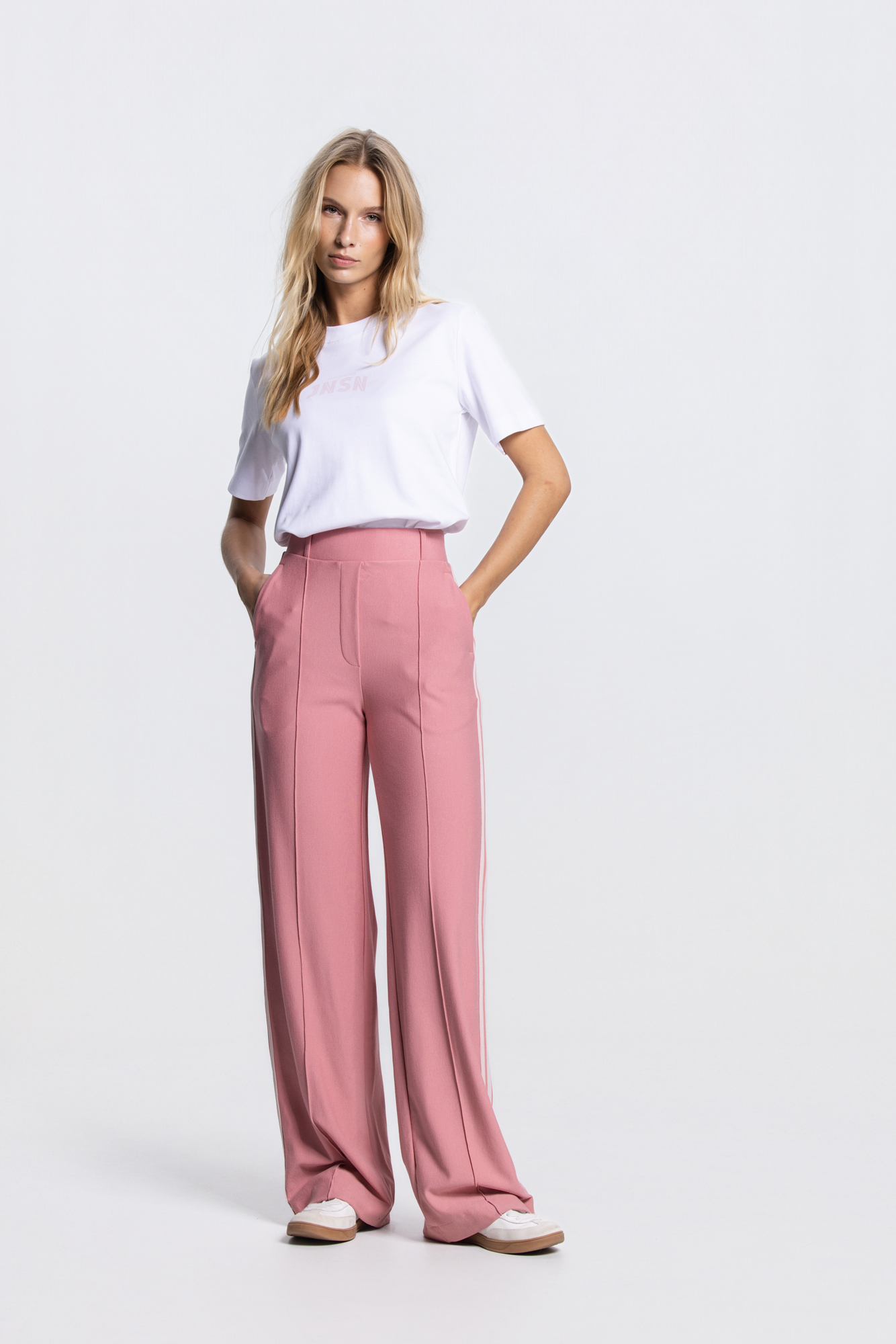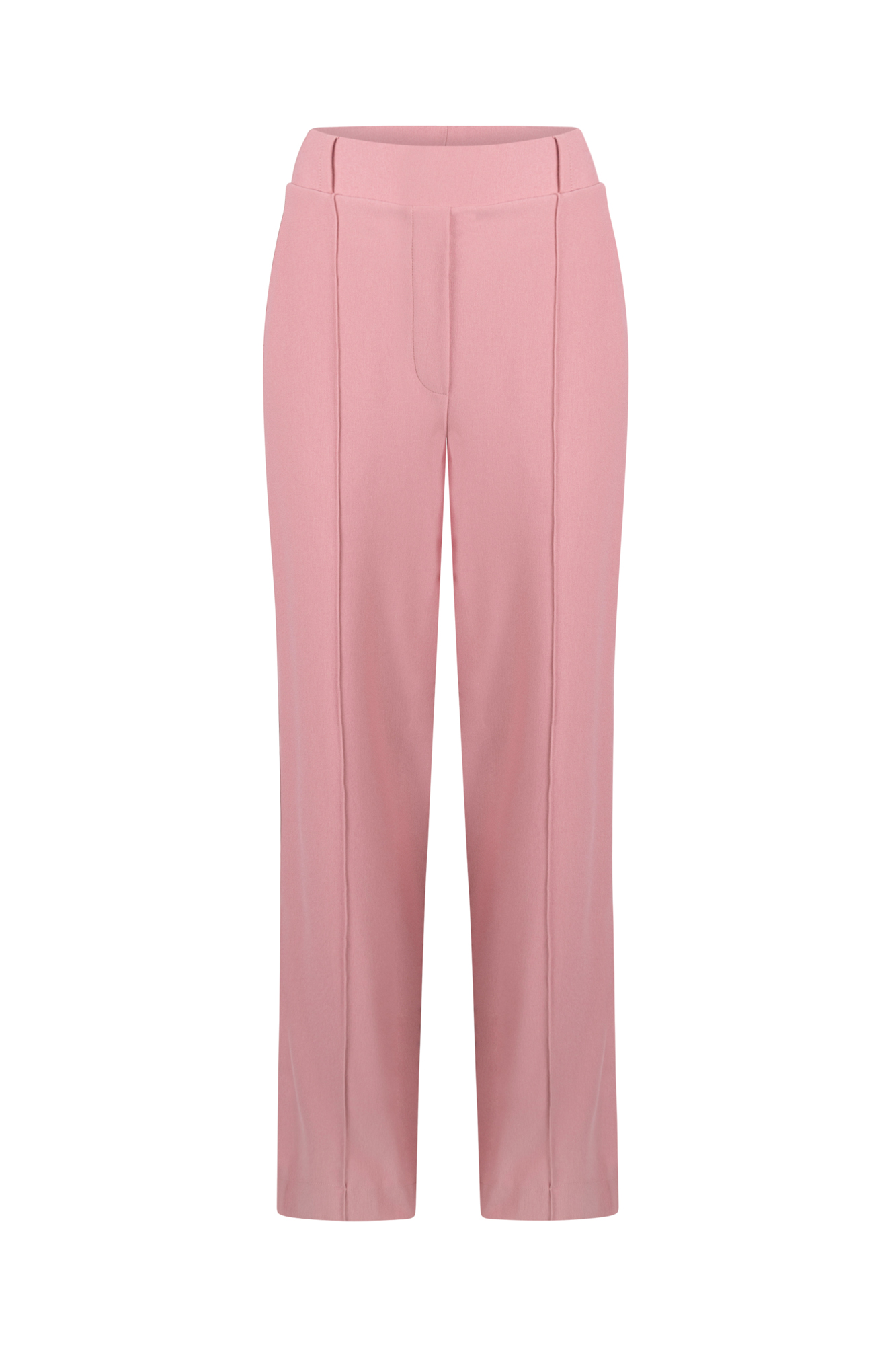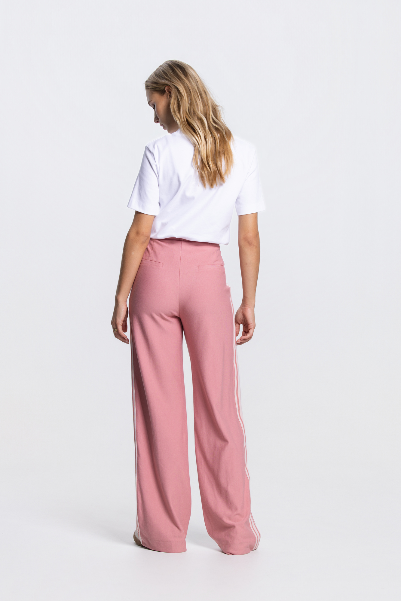 De Aleidas pantalon in blush biedt een vrouwelijke, comfortabele fit met extra stretch. De contrasterende sierbies langs de pijp geeft een subtiele, moderne twist. Afgewerkt met steekzakken, een paspel achterzak en een soepele elastische tailleband.