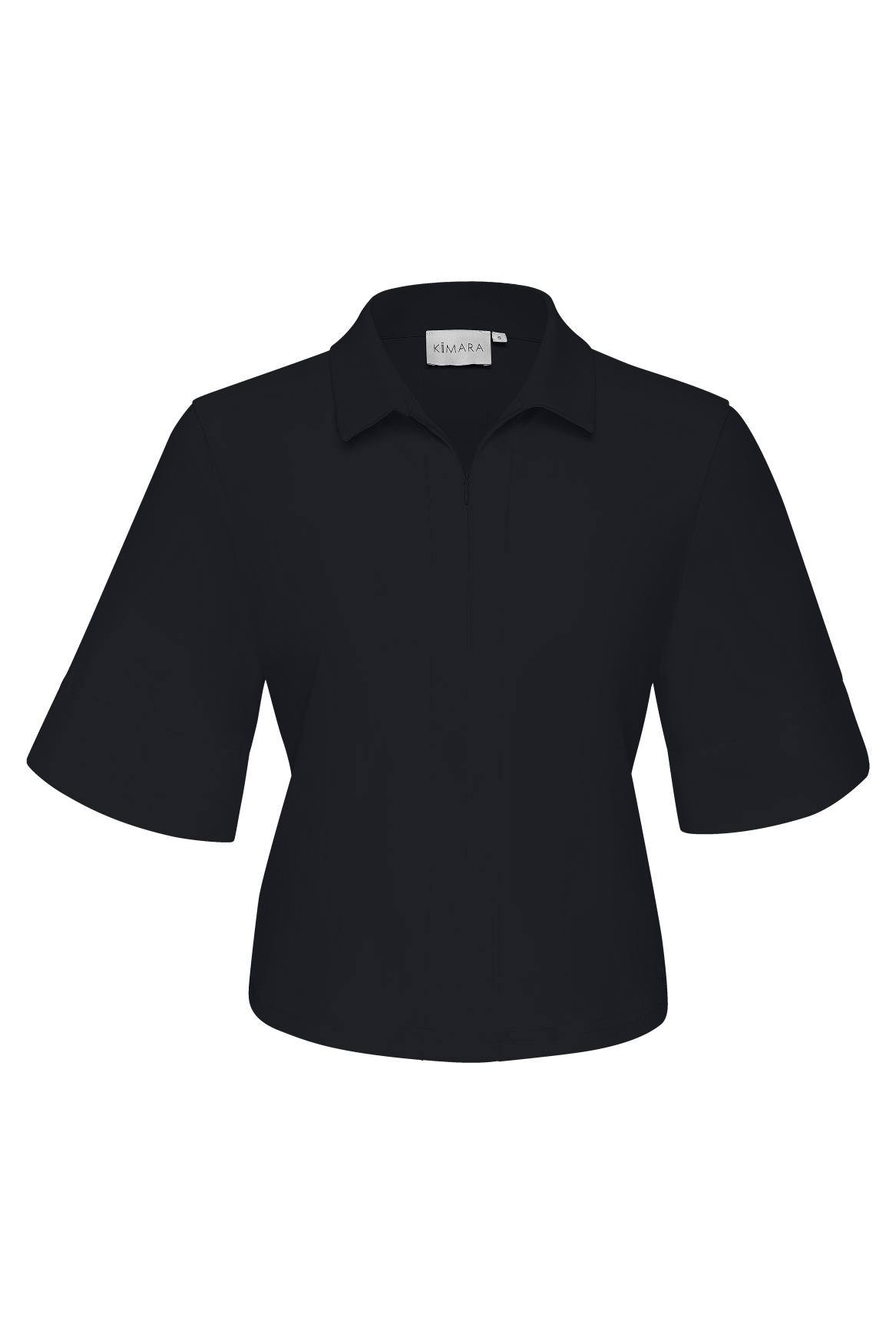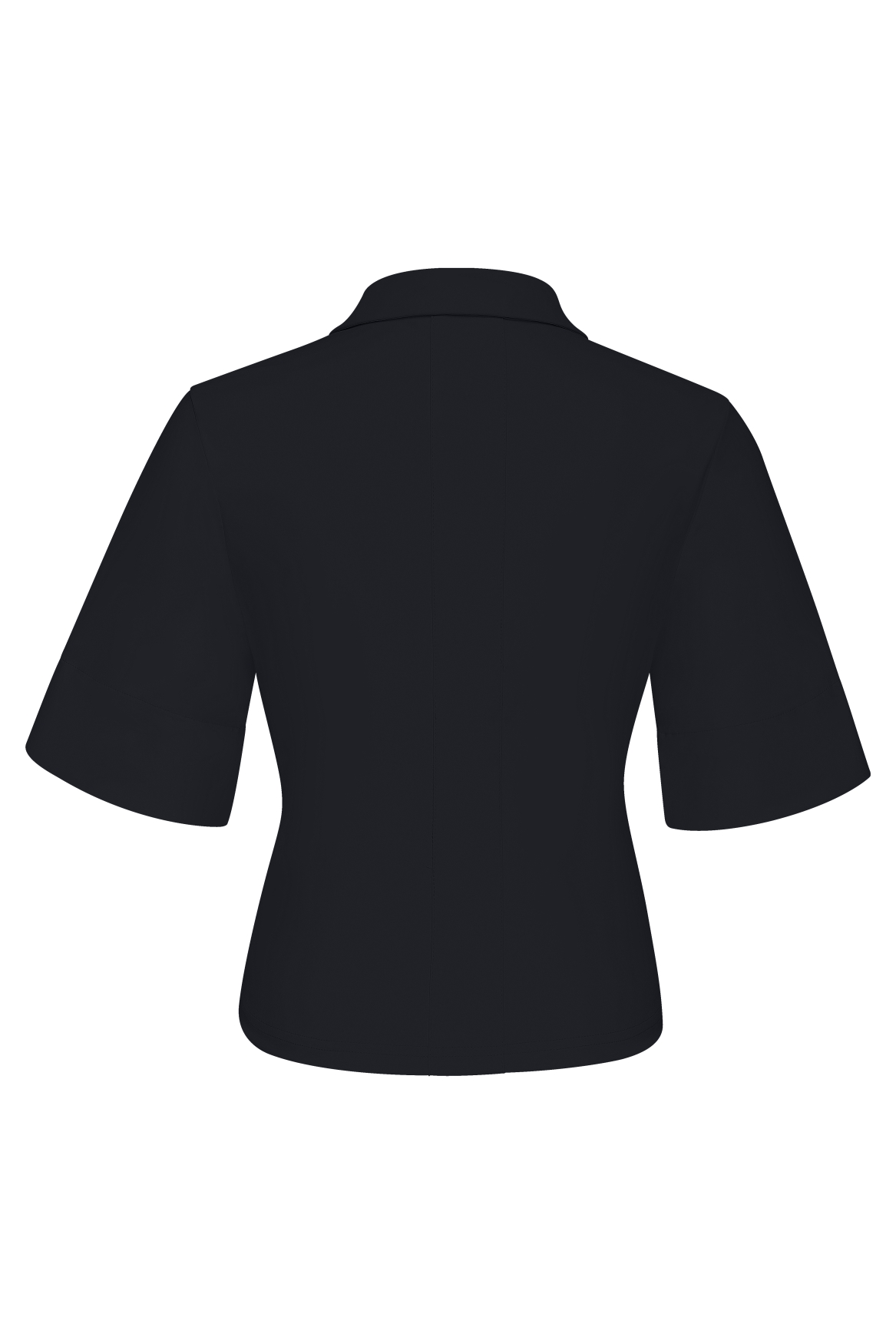 Het ontwerp heeft een strakke, verfijnde kraag en een verborgen half-button placket, wat zorgt voor een clean en sophisticated effect. De korte, rechte mouwen met brede omslag geven de blouse een moderne en licht relaxed look. Het silhouet valt luchtig langs het lichaam, met subtiele taillering voor een vrouwelijke pasvorm.