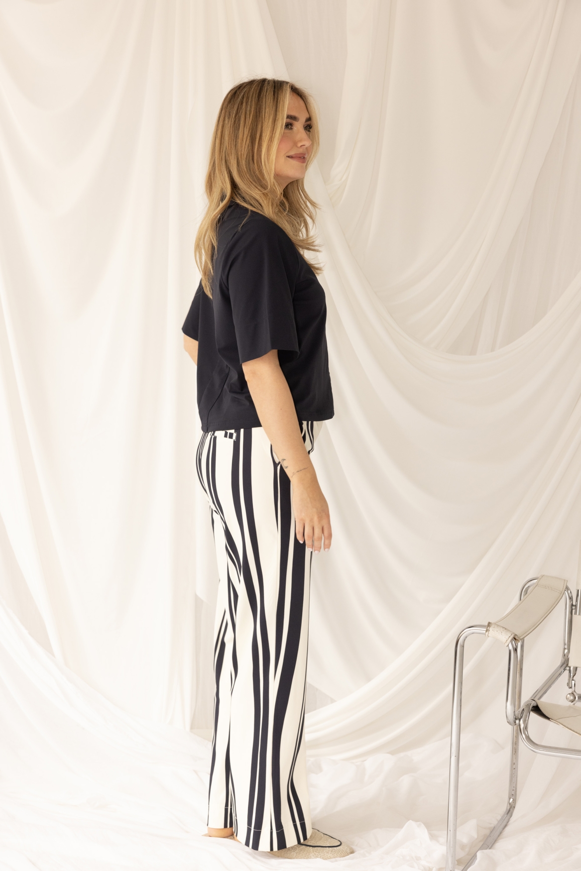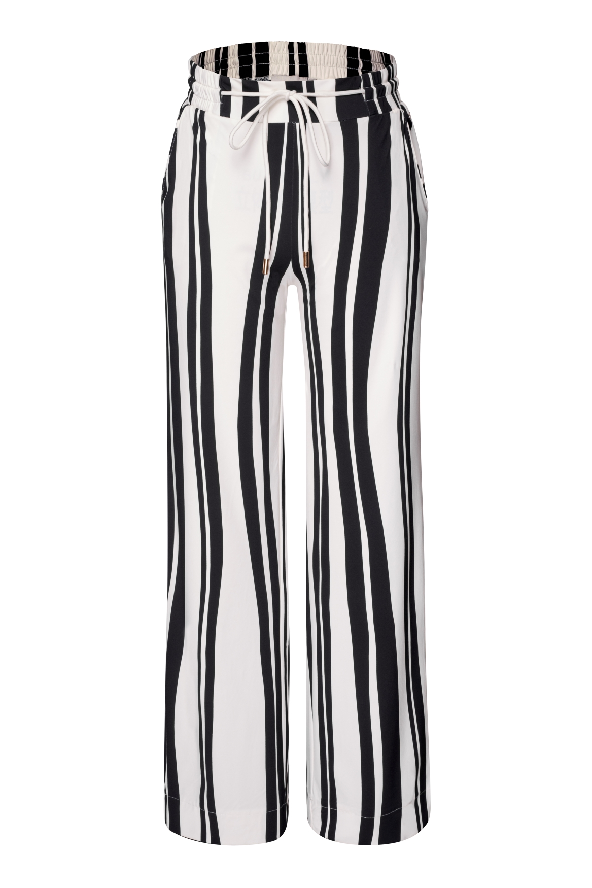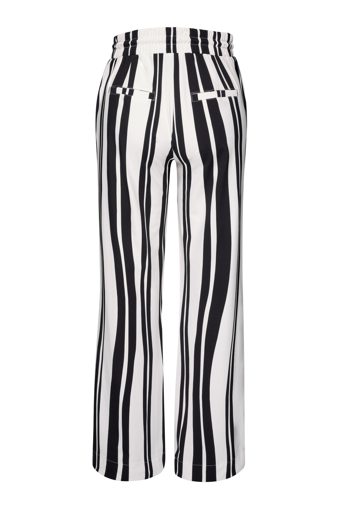 Het ontwerp heeft een comfortabele elastische tailleband met verstelbaar strikkoord met goudkleurige cord‑ends. De rechte pijpen vallen losjes langs het lichaam en creëren een modern, flatterend silhouet. De zwart‑wit golfende strepenprint geeft de broek een krachtige, modieuze uitstraling die direct opvalt. Steekzakken voor en nette faux achterzakken zorgen voor een praktische, elegante finish.