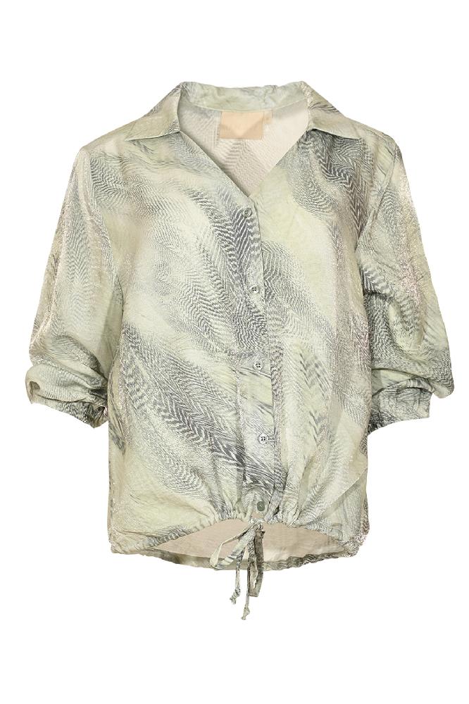 Blouse met een losse pasvorm en een kraag, doorlopende knoopsluiting en 3/4 mouwen met lichte plooien. De zoom is voorzien van een trekkoord, waarmee de blouse naar wens getailleerd kan worden.