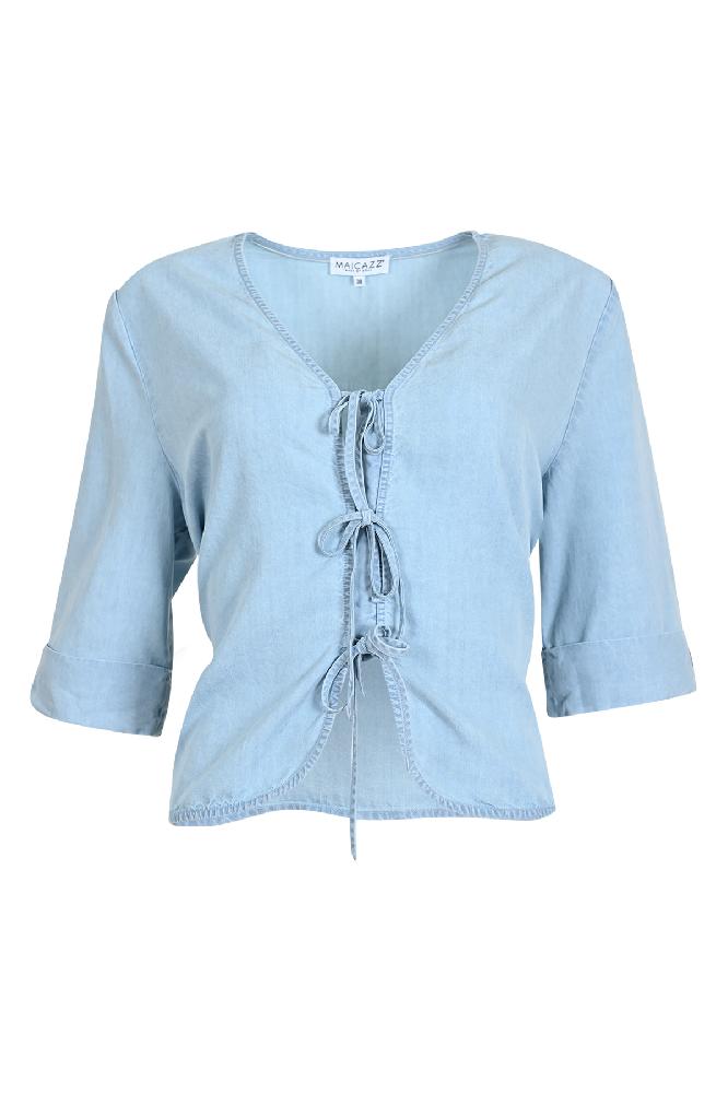 Het Nance gilet is gemaakt van zachte Tencel en heeft een striksluiting aan de voorkant met korte mouwen.