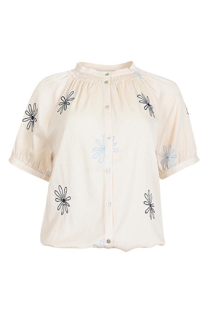 De Naria blouse is een frisse blouse met korte mouwen en een gerimpelde kraag. Gemaakt van lichte stof, perfect voor een casual look in de warmere maanden.