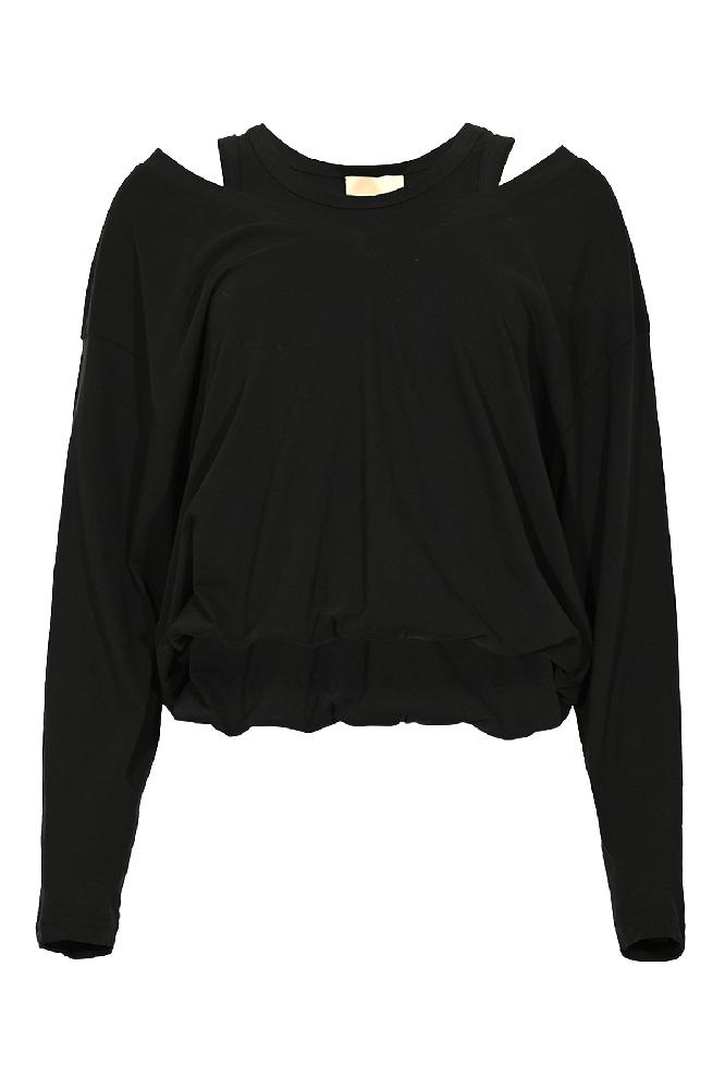 Unieke t shirt met een puffy onderkant, gecombineerd met een vastgemaakt shirt met lange mouwen voor een gelaagd en modieus effect. Deze all-in-one top creëert moeiteloos een trendy look, waarbij comfort en stijl samenkomen in één opvallend item.