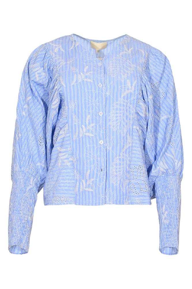 De Shanghai blouse heeft een ronde hals en een doorlopende knoopsluiting. De blouse is afgewerkt met geborduurde details en heeft lange mouwen met een gesmockte manchet.
