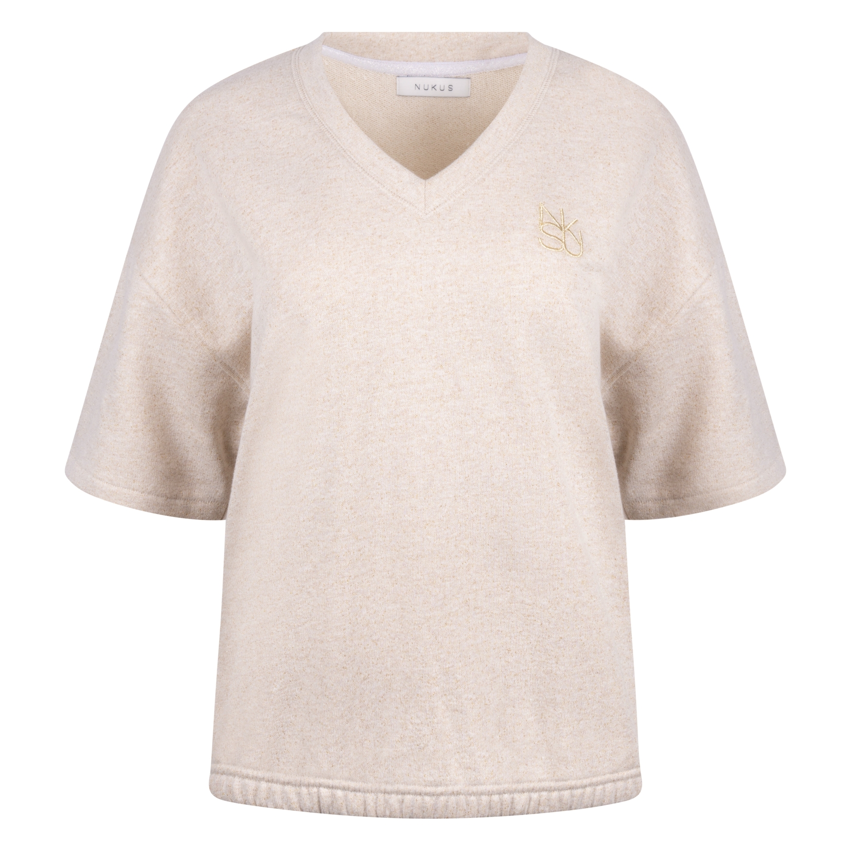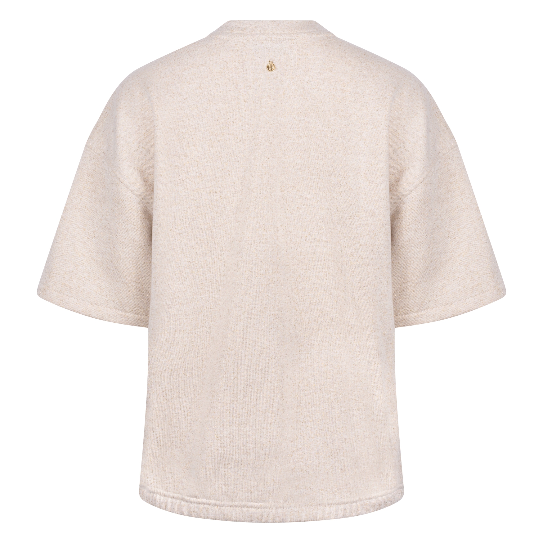 Deze korte mouw sweater met V-hals heeft een subtiel logo op de borst en een fijn lurex draadje voor een lichte glans. Het elastiek aan de onderkant zorgt voor een nonchalant effect. Draag hem als set met de Rachel Pants of combineer met een jeans of pantalon voor een stijlvolle, casual look.
