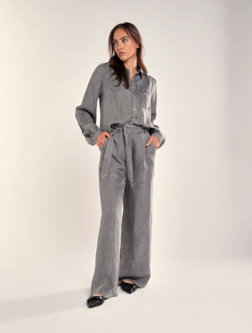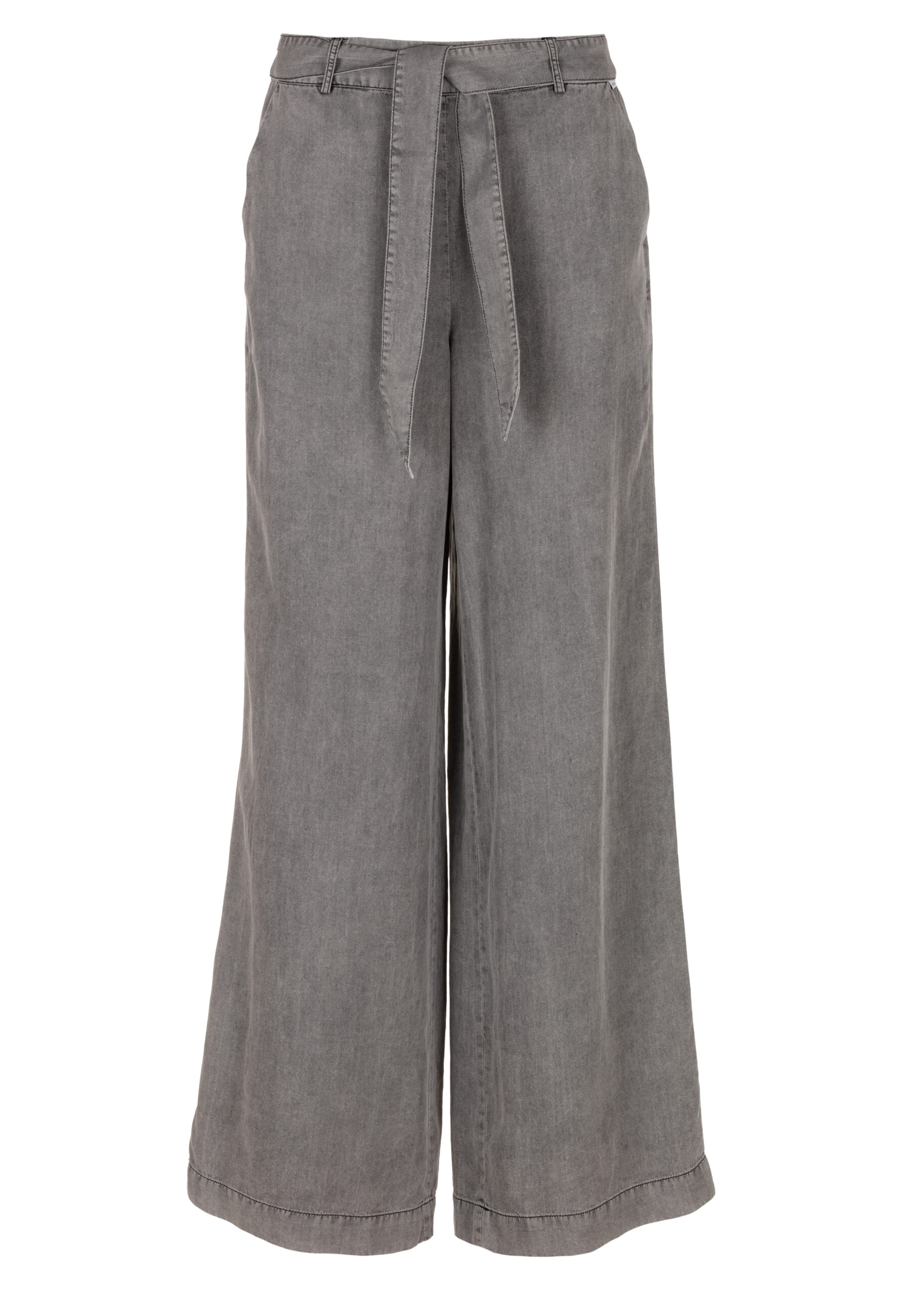 Deze wijde broek is vervaardigd uit 100% Tencel in een washed black denim look. De soepele en ademende stof voelt zacht aan op de huid en biedt een comfortabele draagervaring. De elastische tailleband met strap detail zorgt voor een ontspannen pasvorm en een moderne uitstraling. Perfect voor zowel casual als meer geklede looks.