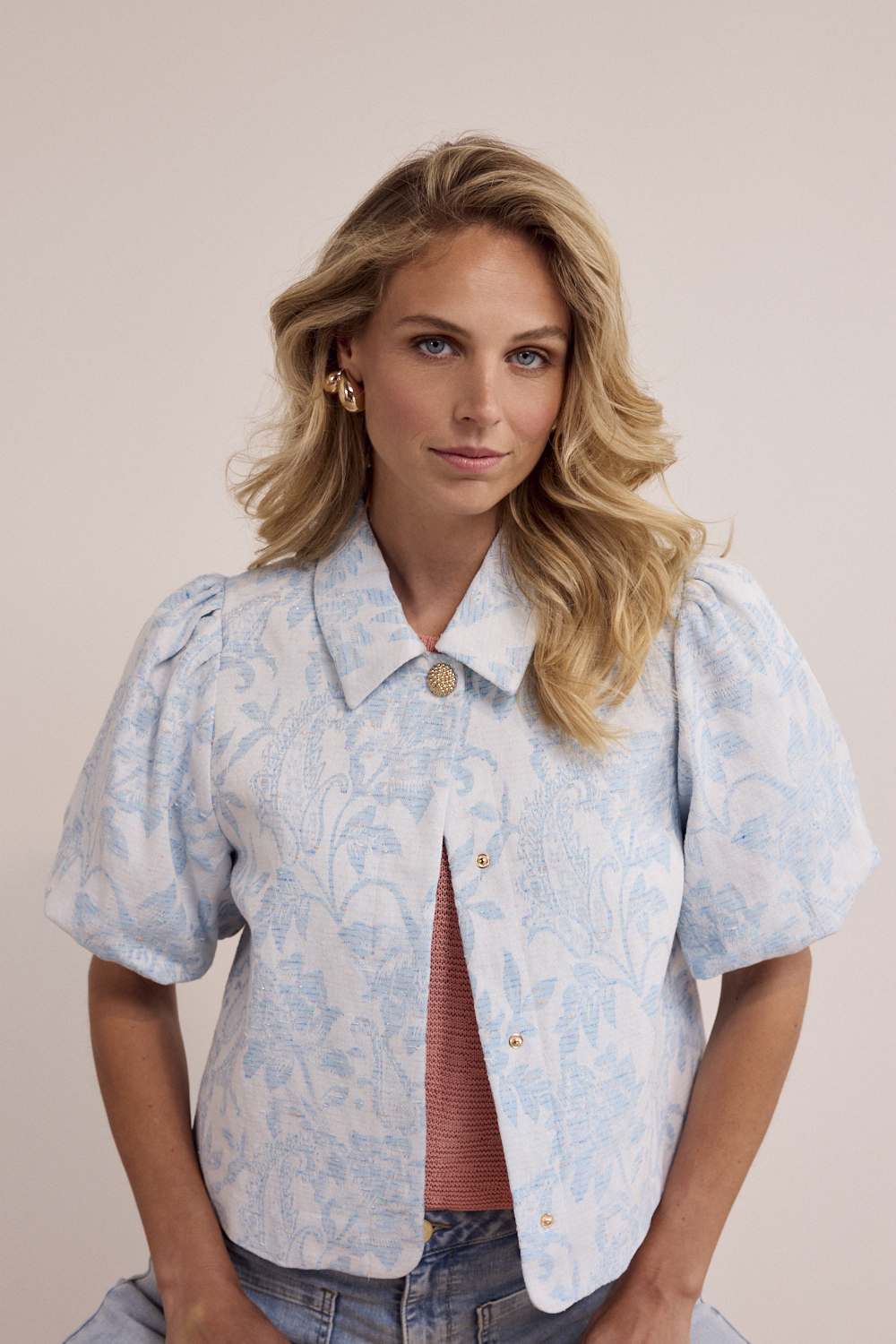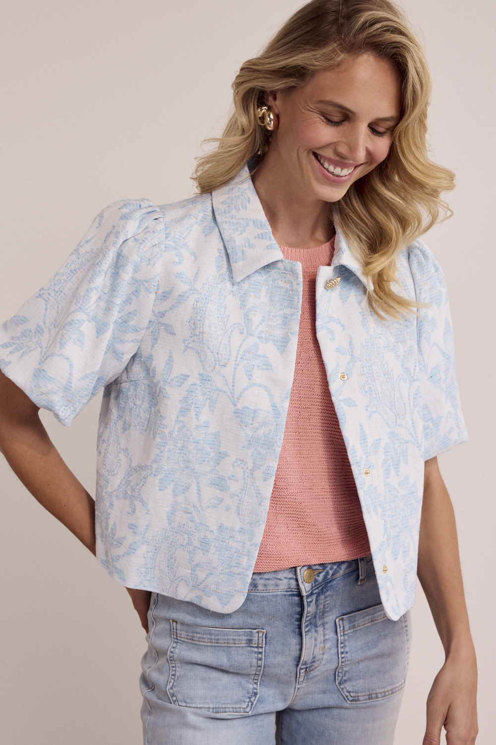 De Denim Jacquard Jacket is een verfijnde en eigentijdse jacket met een zachte, vrouwelijke uitstraling en een subtiel luxe karakter. Deze jacket is vervaardigd uit een rijke jacquard denimkwaliteit van 70% katoen en 30% polyester, met een comfortabele voering van 100% viscose voor een prettige draagervaring. Het verfijnde jacquard dessin in de kleur Light Blue Denim geeft het ontwerp een elegante diepte en een stijlvolle twist op klassiek denim. De korte mouwen en licht getailleerde pasvorm zorgen voor een moderne, luchtige look, terwijl de klassieke kraag en decoratieve knoopsluiting aan de voorzijde het geheel een chic accent geven.